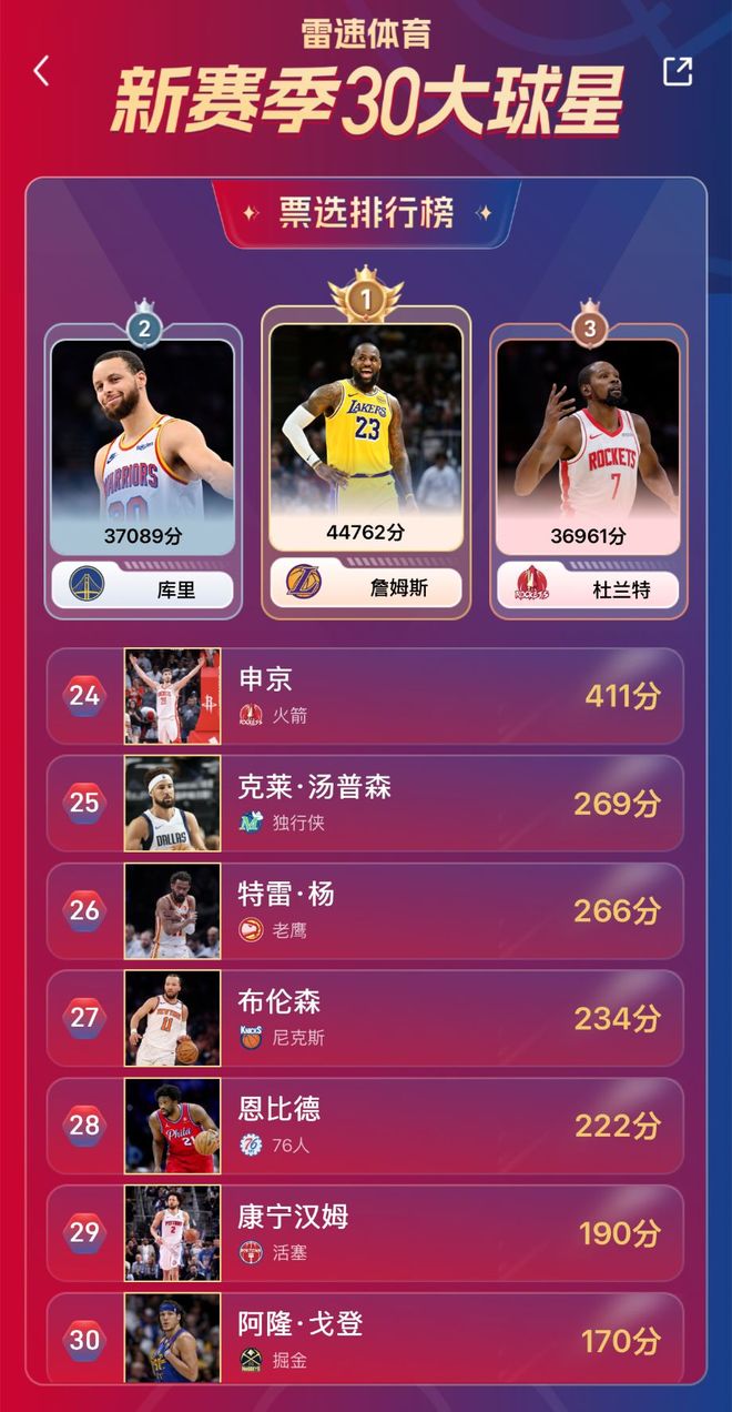 目前雷速NBA新赛季30大球星排名结果如下: